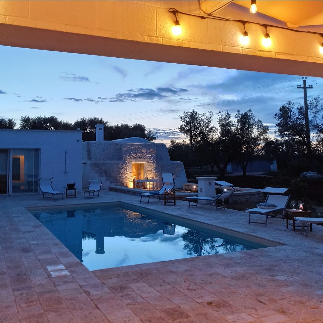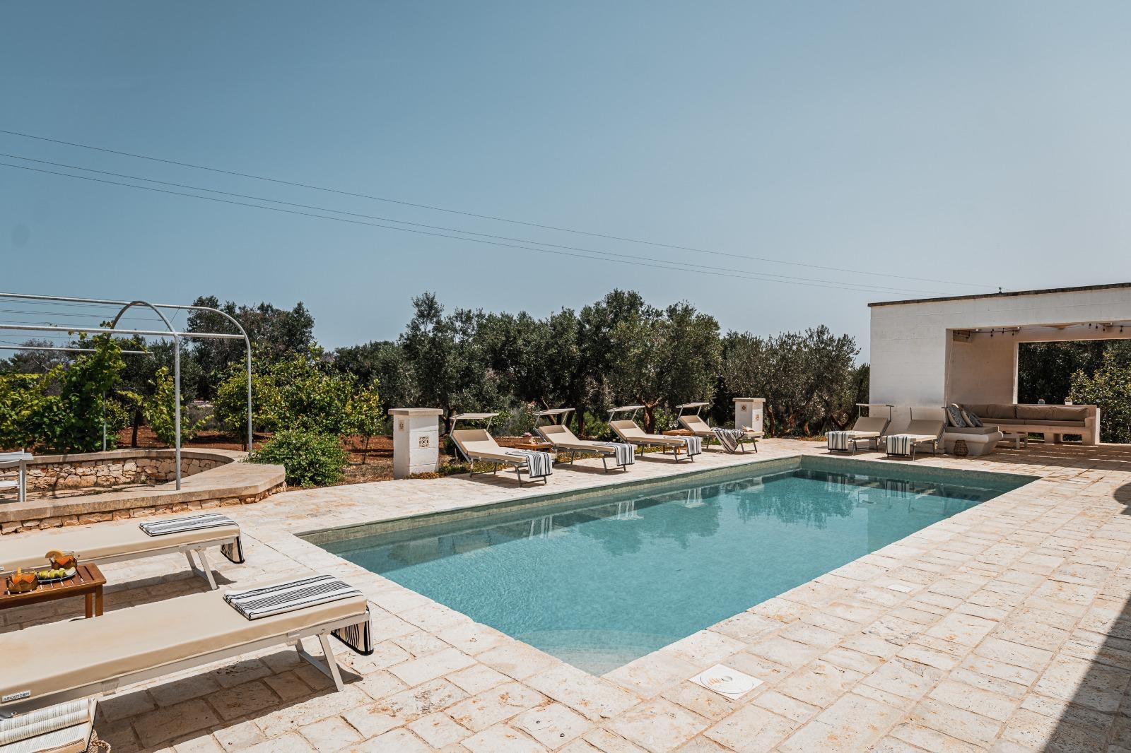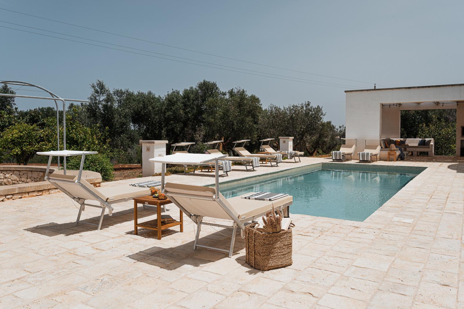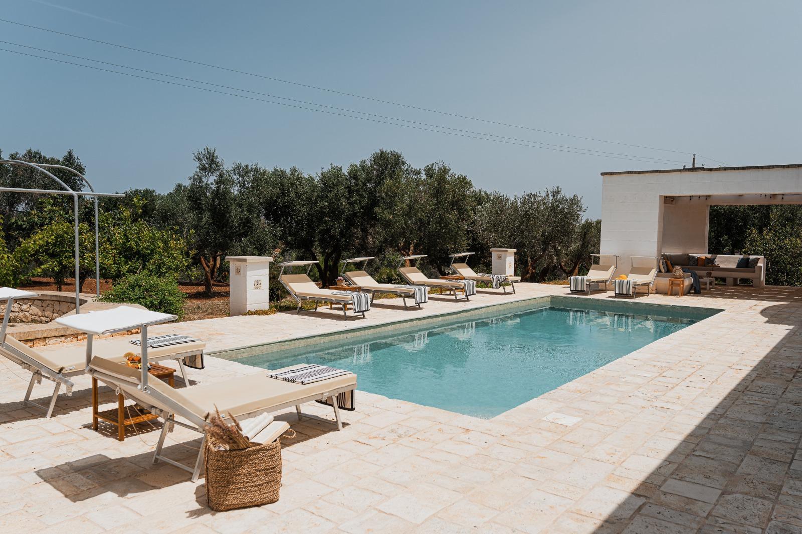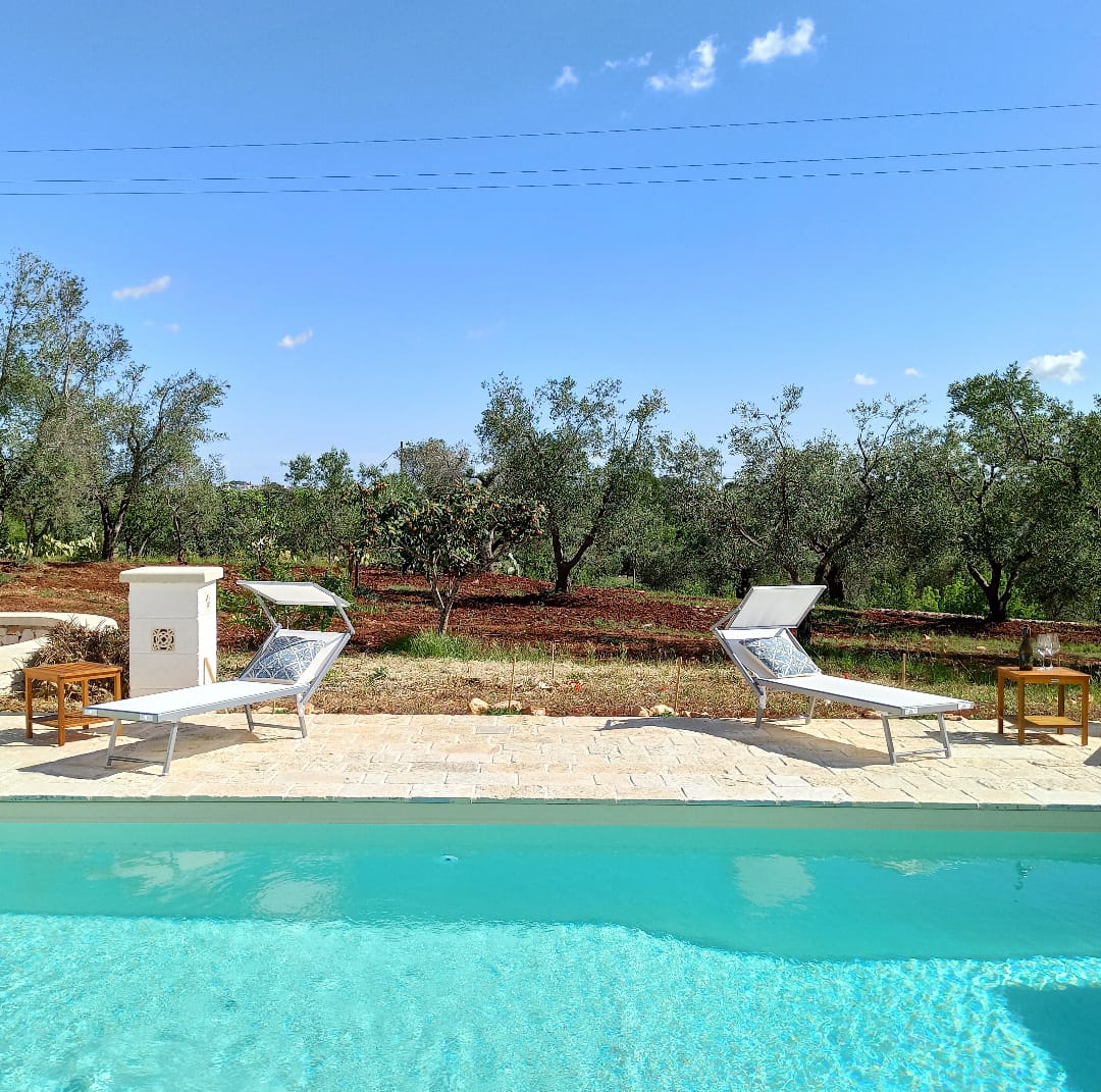 A far da cornice a tutto vi sono le verdi e rigogliose chiome degli ulivi della vallata che circondano una splendida piscina dalle forme classiche e dal colore turchino vivace, attorno alla quale ci si può comodamente distendere e rilassarsi rigenerandosi vivendo la Puglia nella sua autenticità, in assoluta pace e relax.