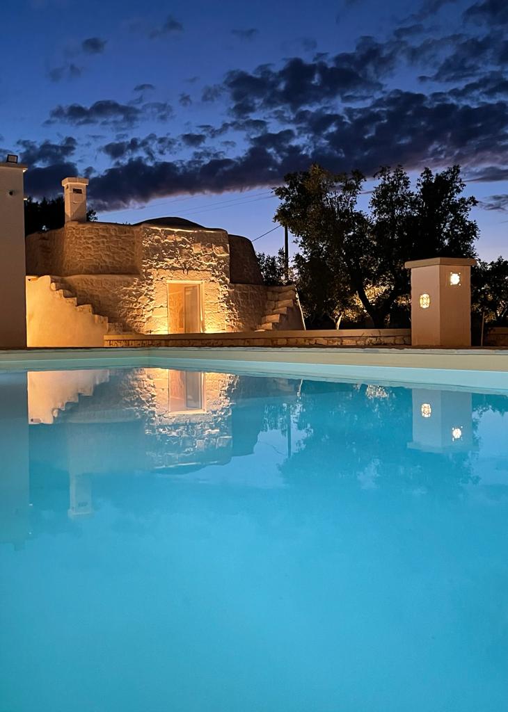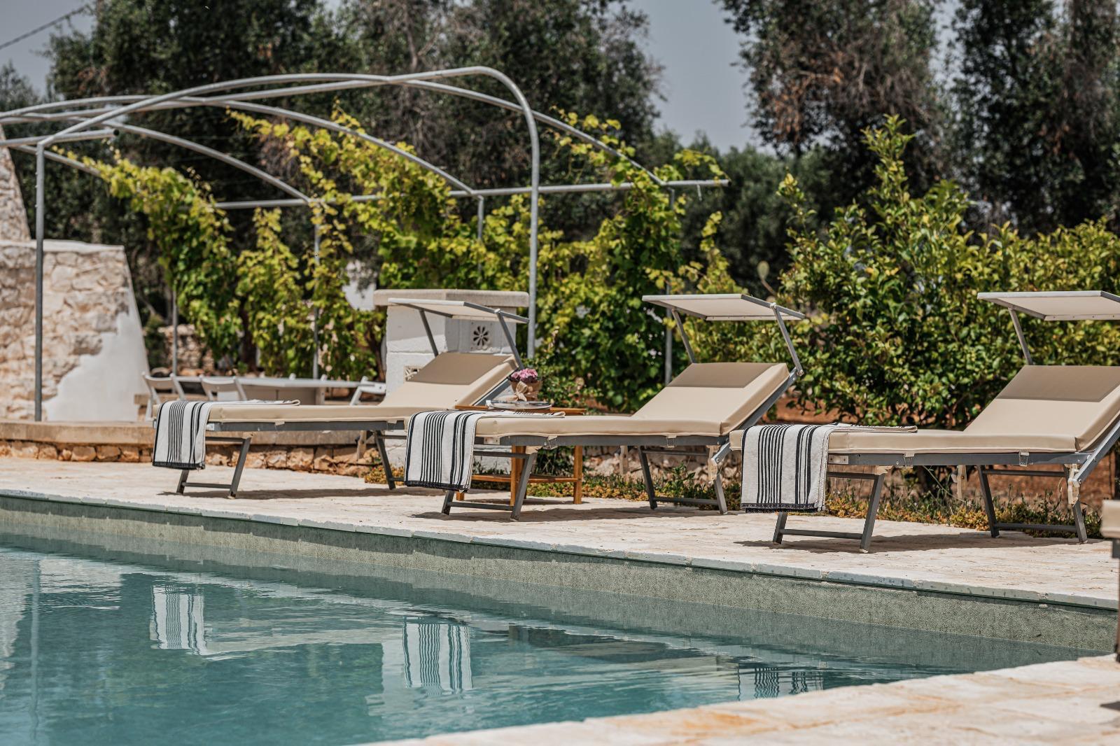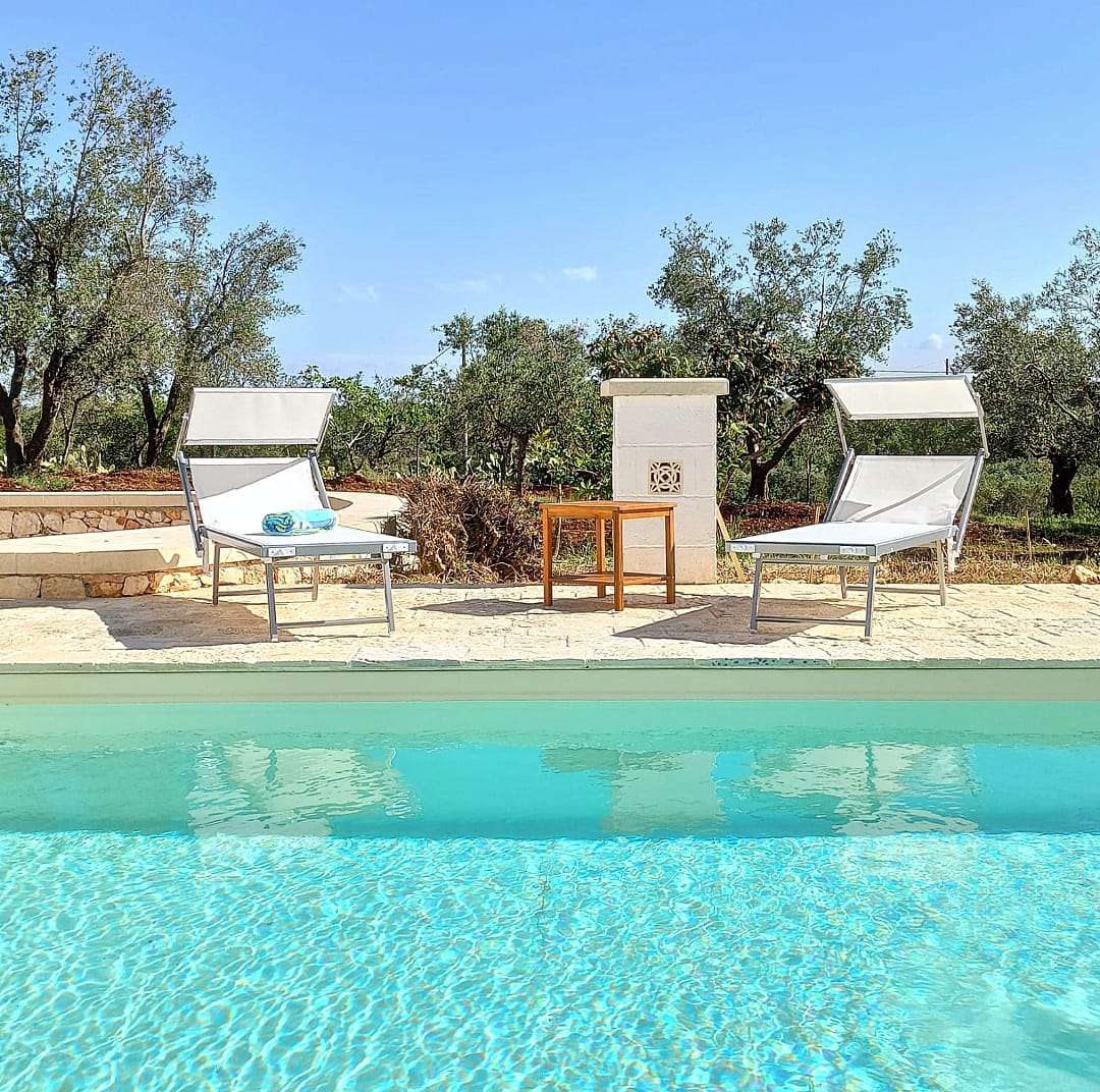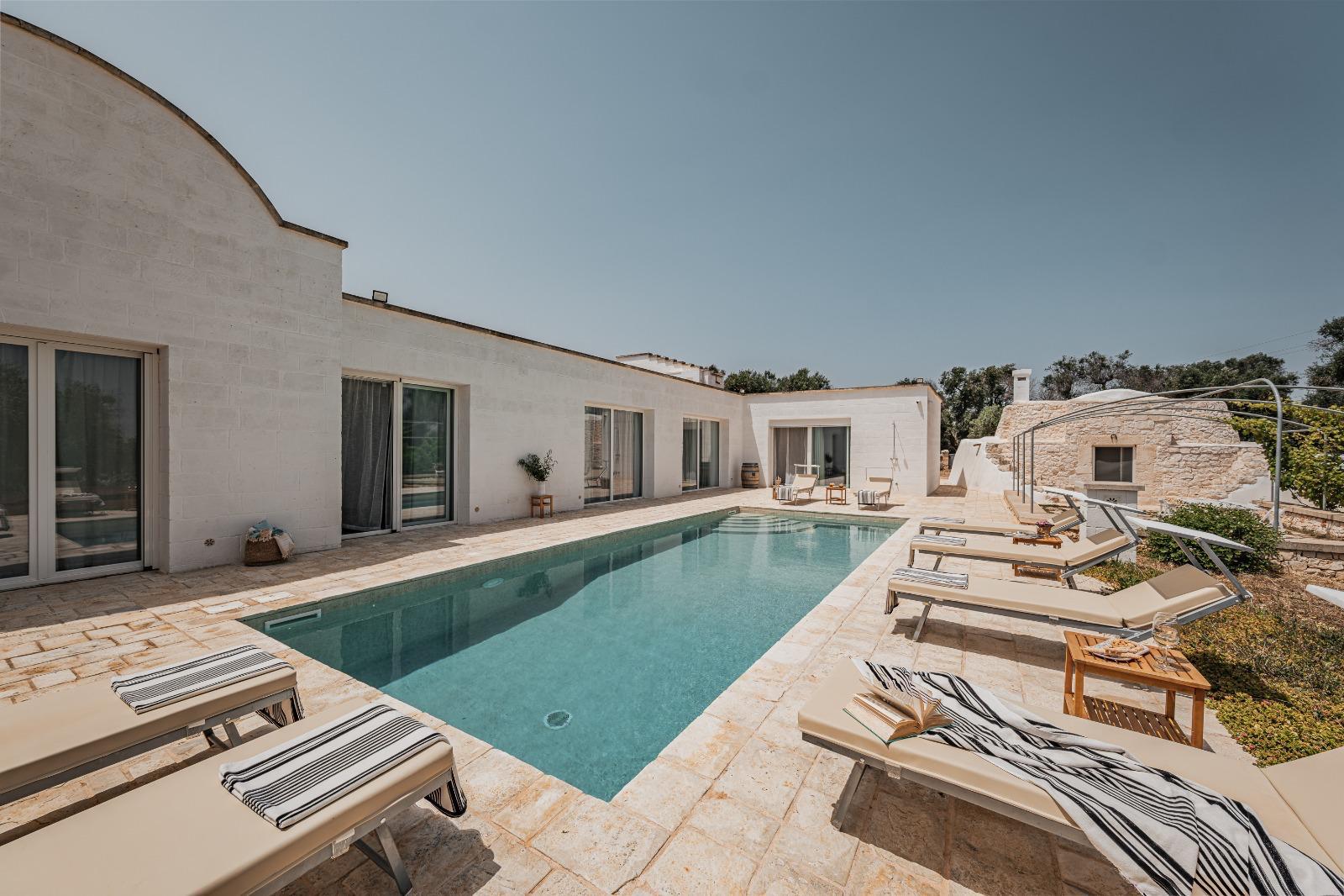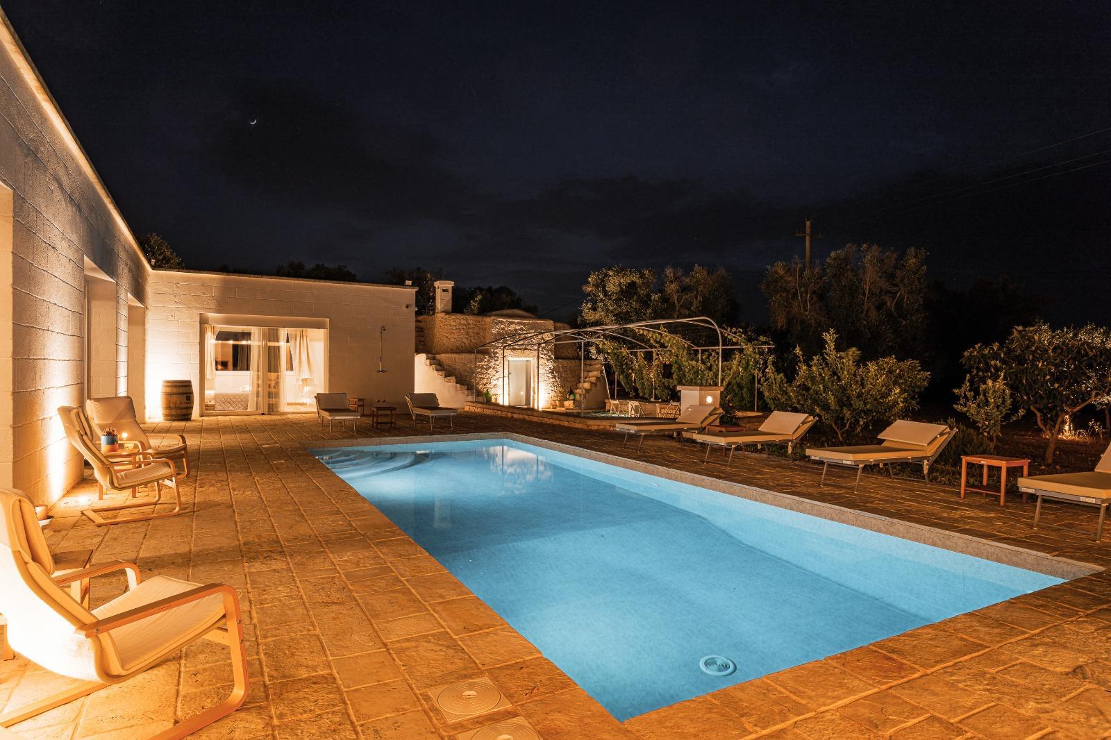 A far da cornice a tutto vi sono le verdi e rigogliose chiome degli ulivi della vallata che circondano una splendida piscina dalle forme classiche e dal colore turchino vivace, attorno alla quale ci si può comodamente distendere e rilassarsi rigenerandosi vivendo la Puglia nella sua autenticità, in assoluta pace e relax.