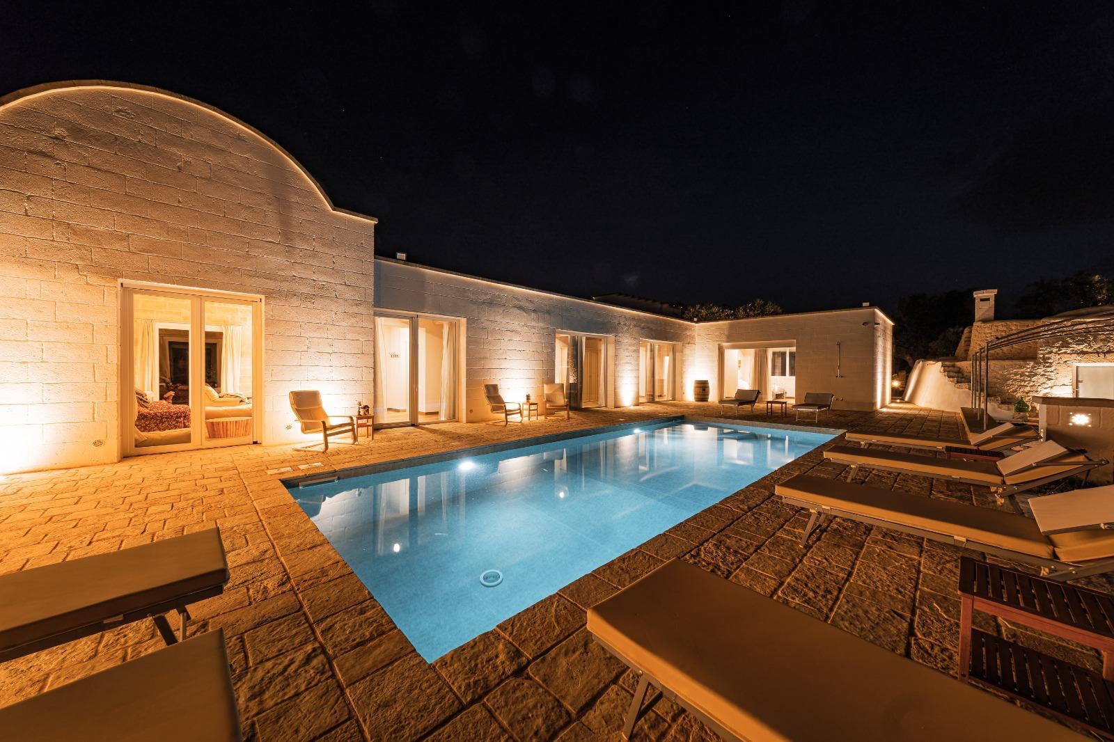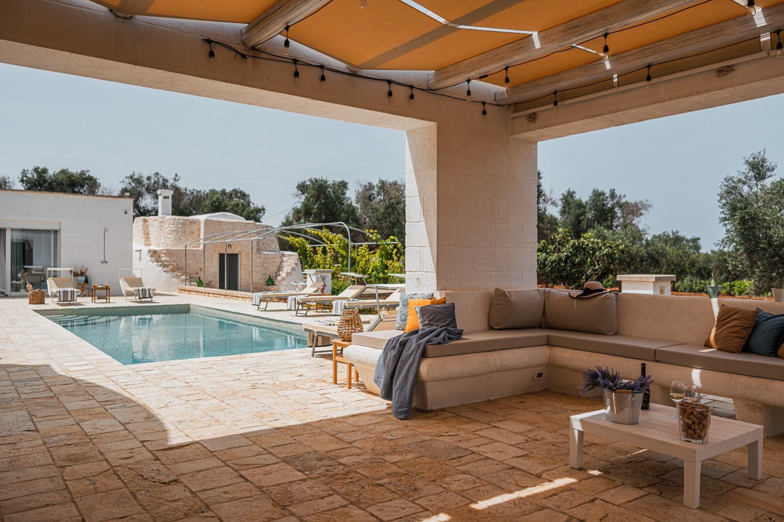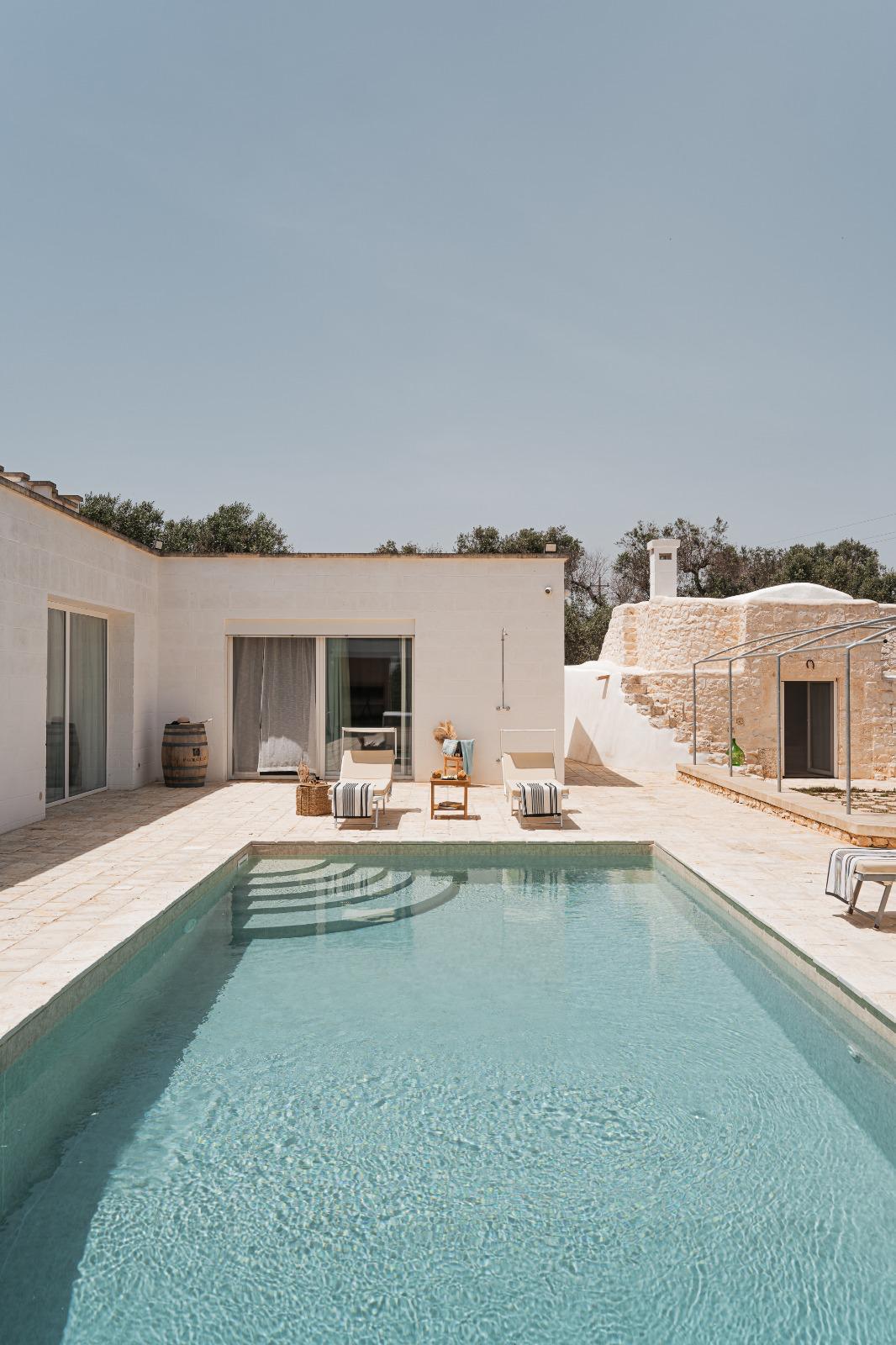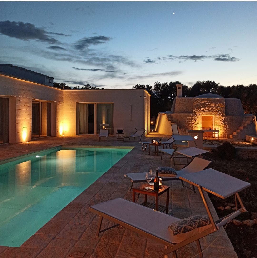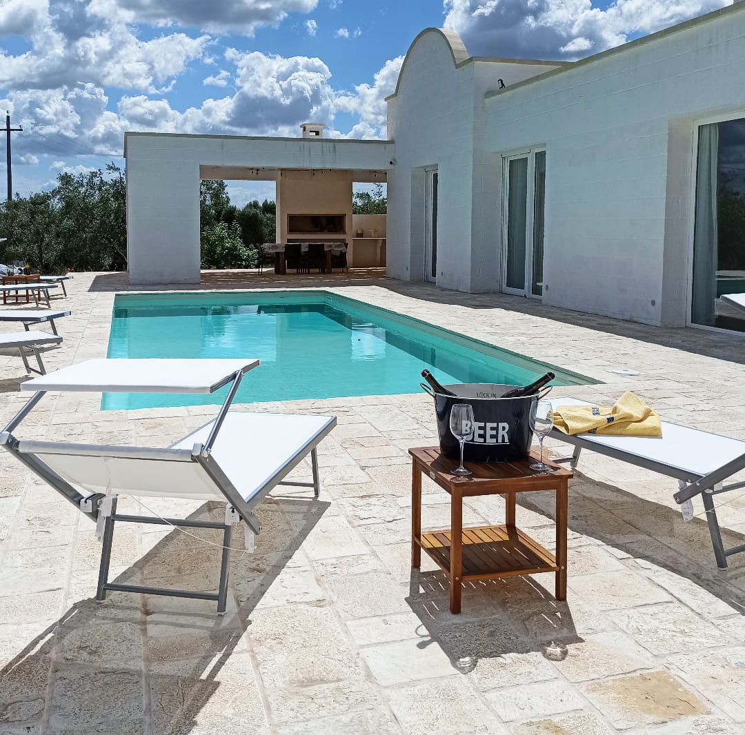 A far da cornice a tutto vi sono le verdi e rigogliose chiome degli ulivi della vallata che circondano una splendida piscina dalle forme classiche e dal colore turchino vivace, attorno alla quale ci si può comodamente distendere e rilassarsi rigenerandosi vivendo la Puglia nella sua autenticità, in assoluta pace e relax.