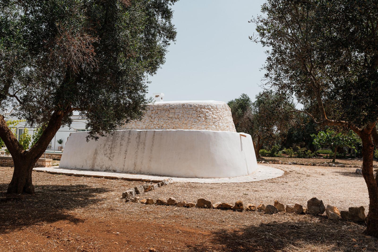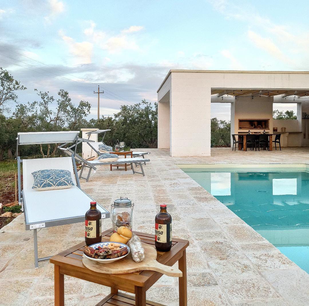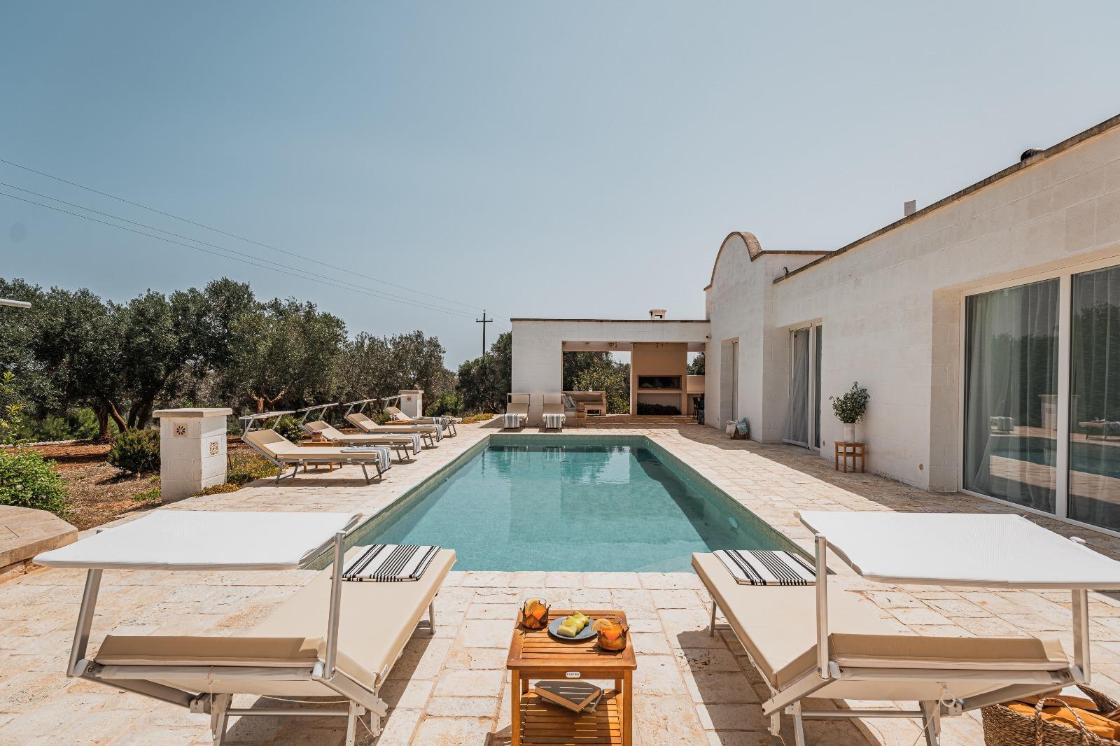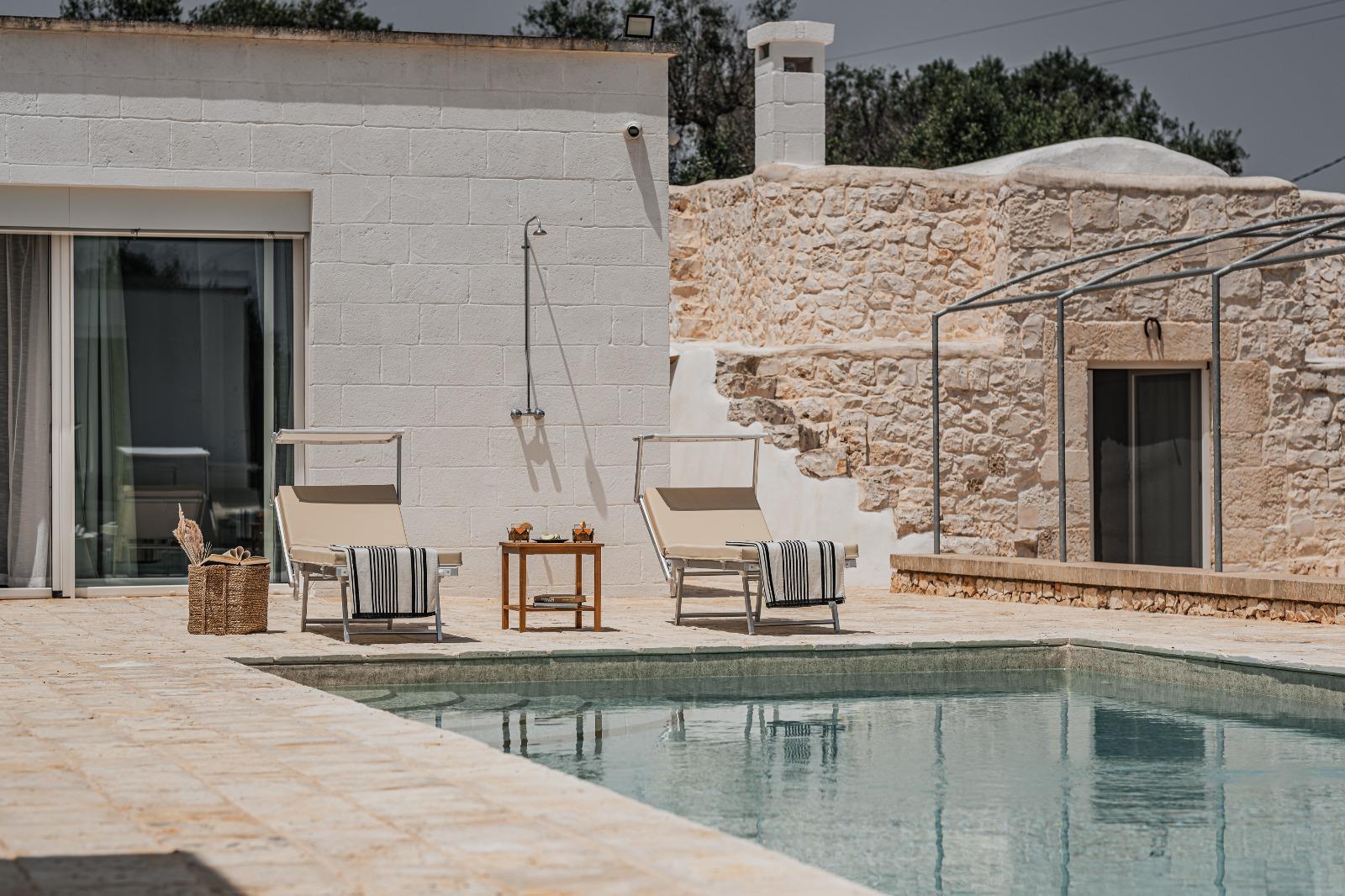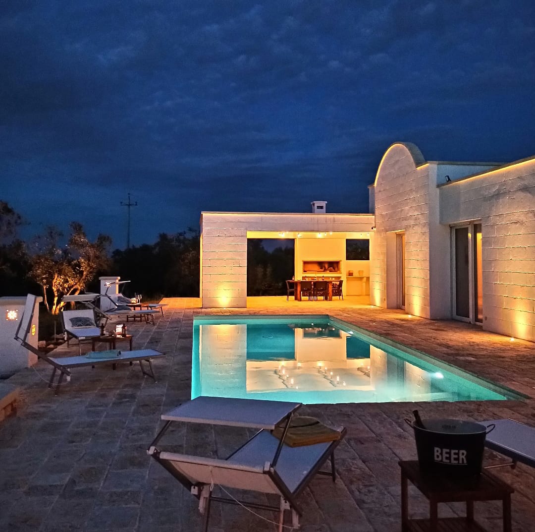 A far da cornice a tutto vi sono le verdi e rigogliose chiome degli ulivi della vallata che circondano una splendida piscina dalle forme classiche e dal colore turchino vivace, attorno alla quale ci si può comodamente distendere e rilassarsi rigenerandosi vivendo la Puglia nella sua autenticità, in assoluta pace e relax.