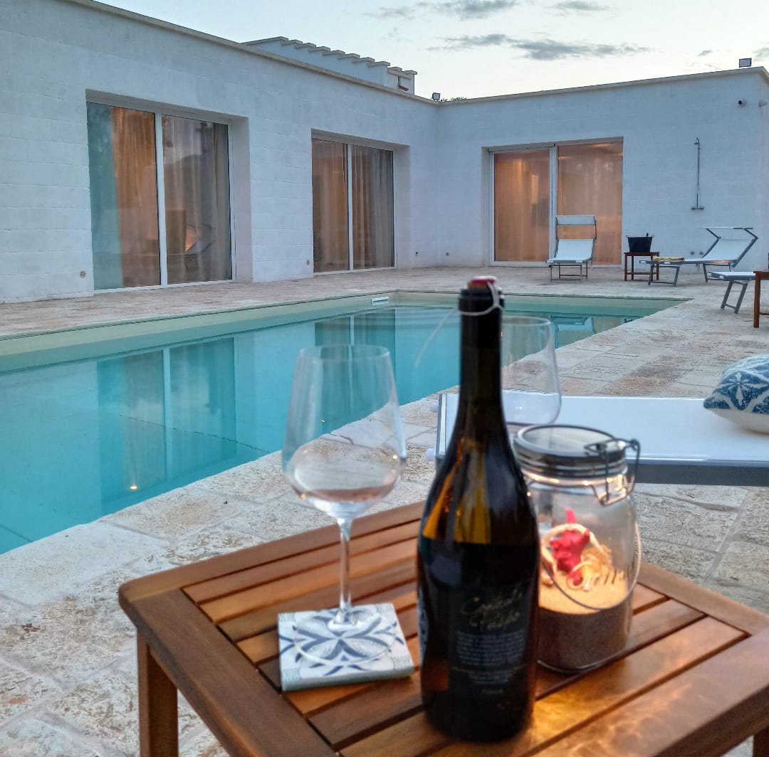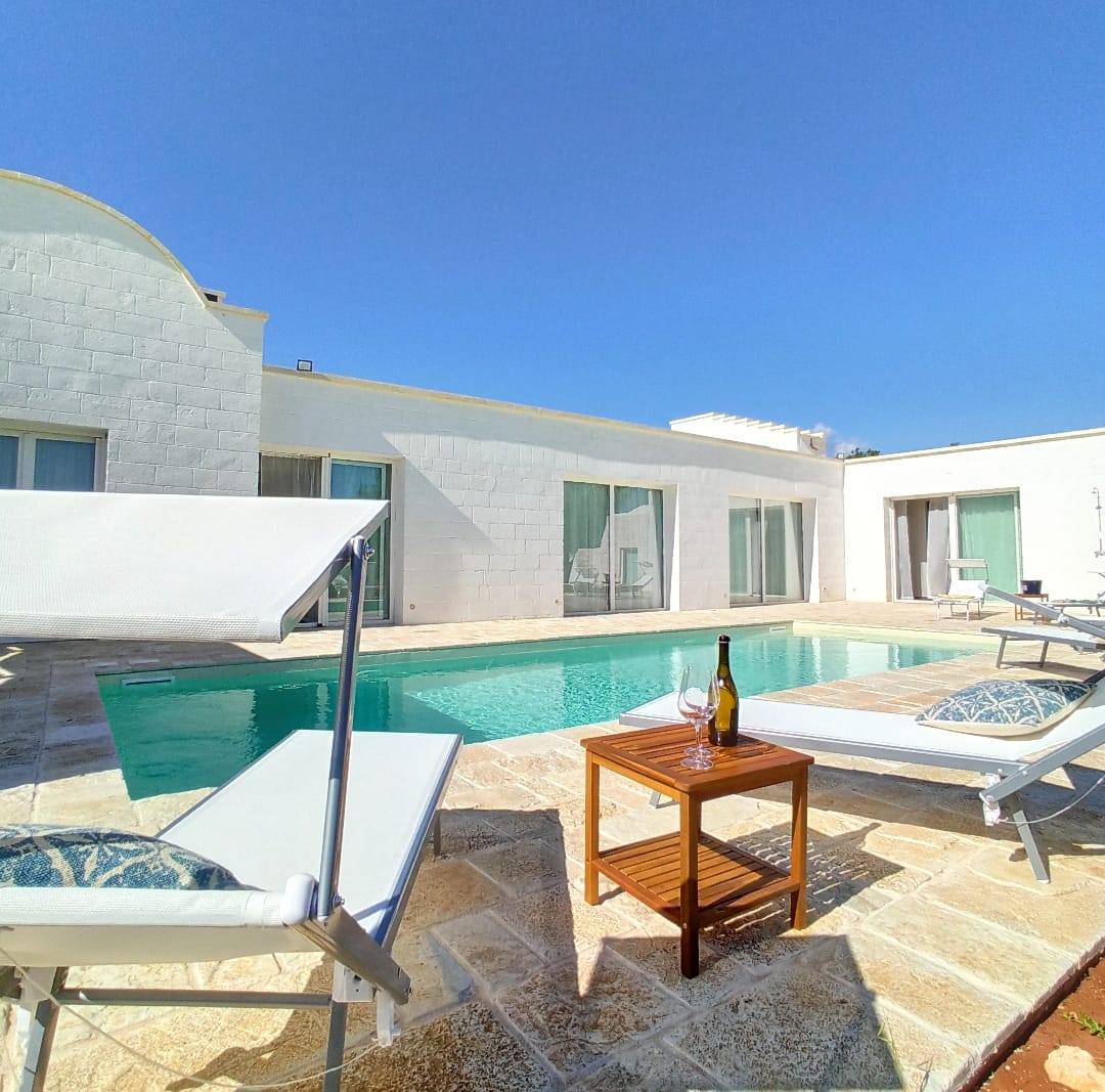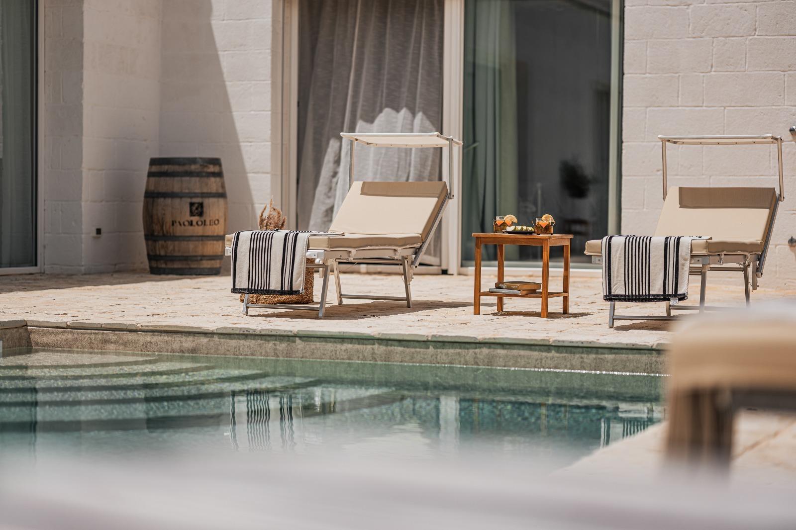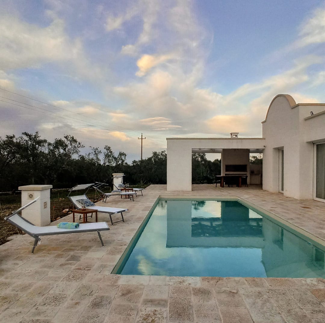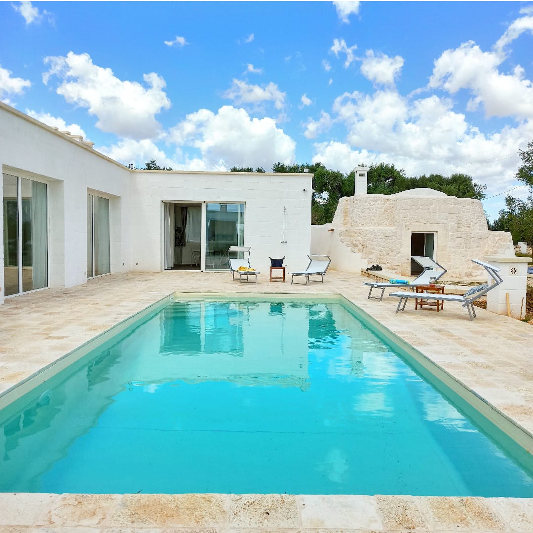 A far da cornice a tutto vi sono le verdi e rigogliose chiome degli ulivi della vallata che circondano una splendida piscina dalle forme classiche e dal colore turchino vivace, attorno alla quale ci si può comodamente distendere e rilassarsi rigenerandosi vivendo la Puglia nella sua autenticità, in assoluta pace e relax.