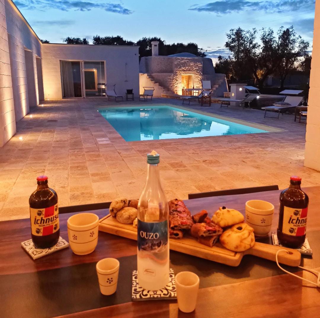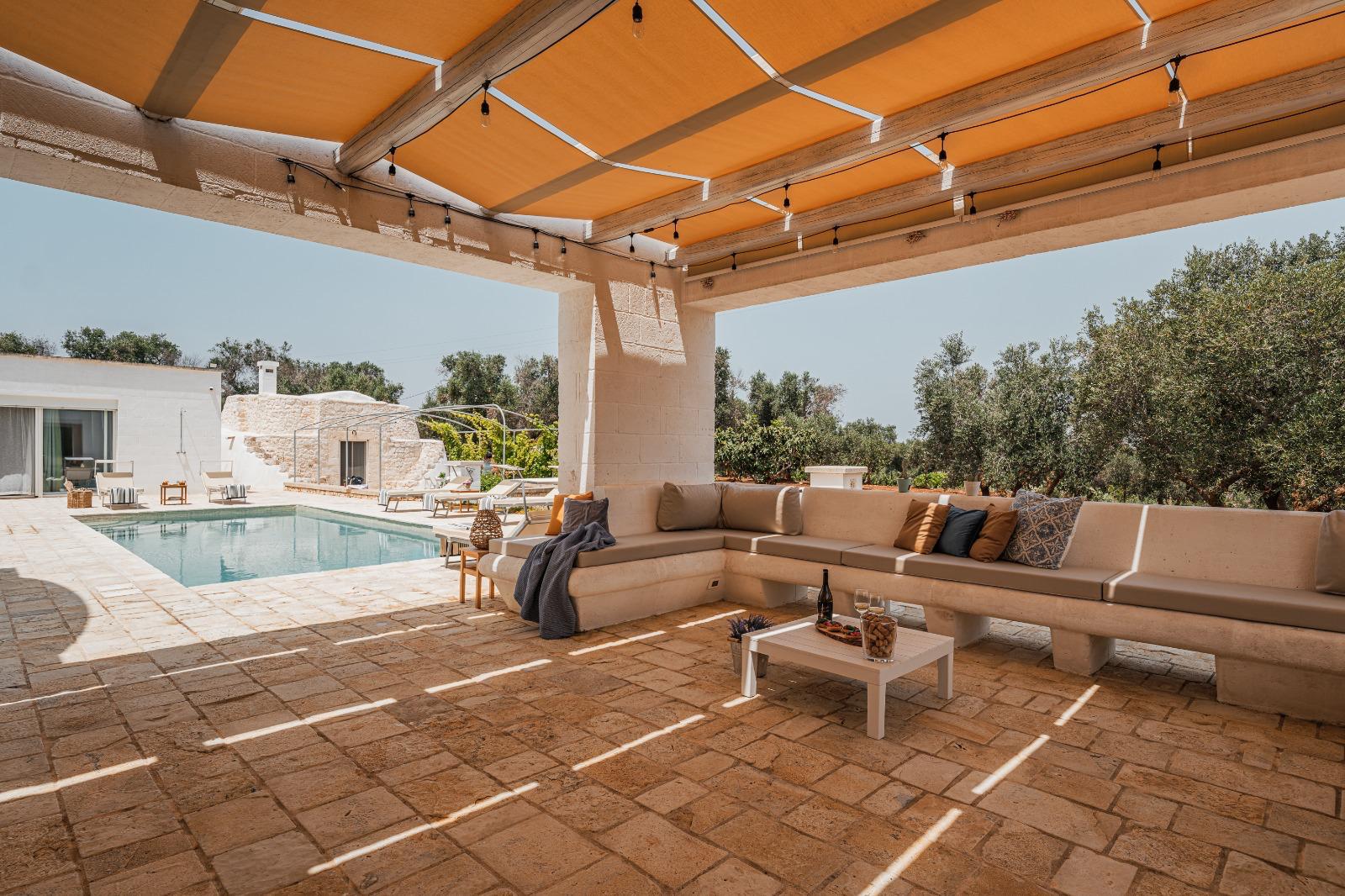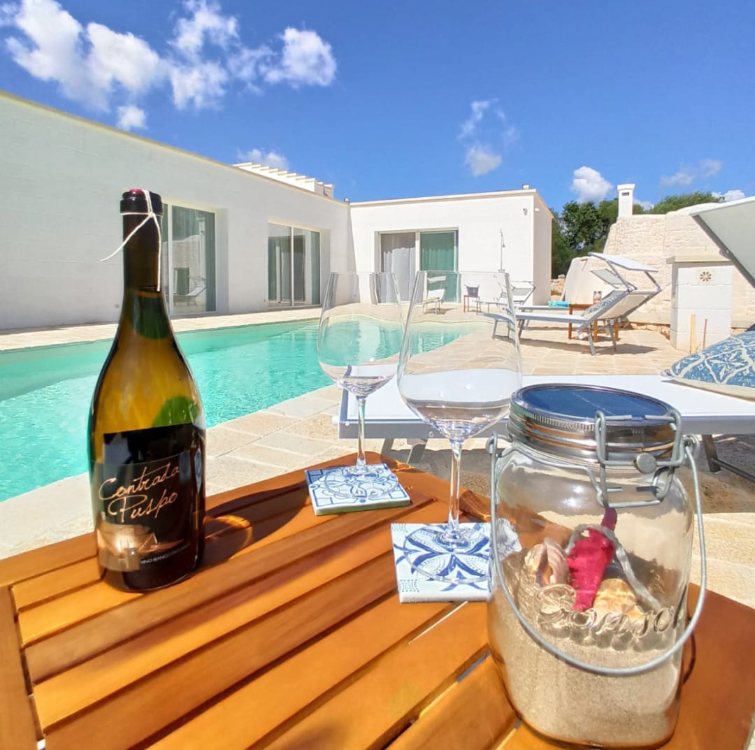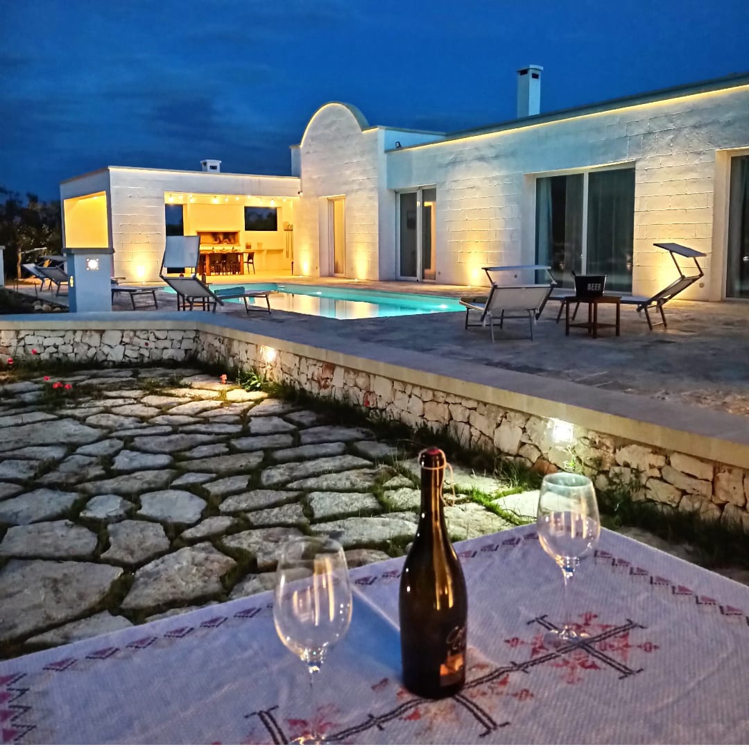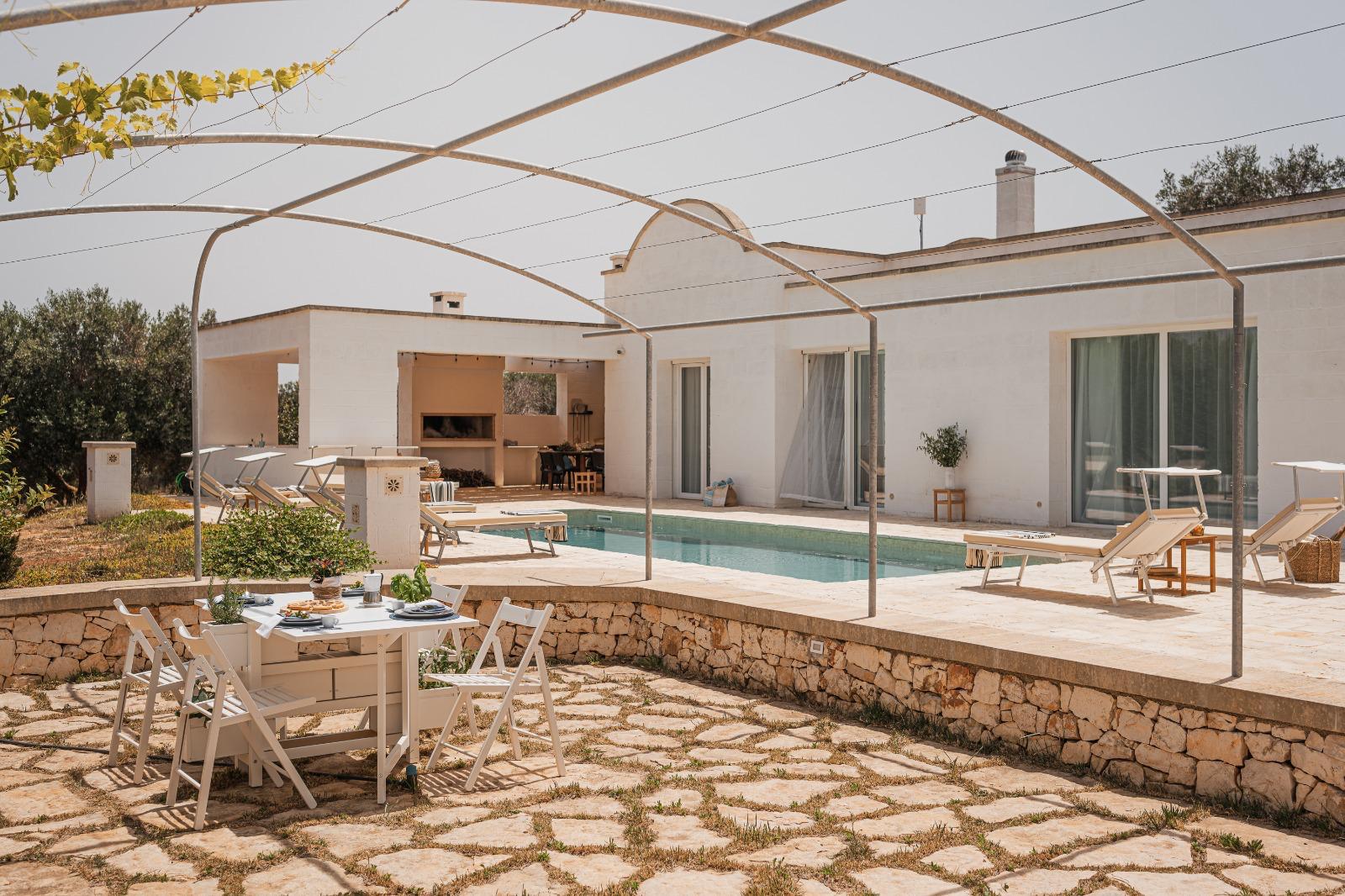 A far da cornice a tutto vi sono le verdi e rigogliose chiome degli ulivi della vallata che circondano una splendida piscina dalle forme classiche e dal colore turchino vivace, attorno alla quale ci si può comodamente distendere e rilassarsi rigenerandosi vivendo la Puglia nella sua autenticità, in assoluta pace e relax.