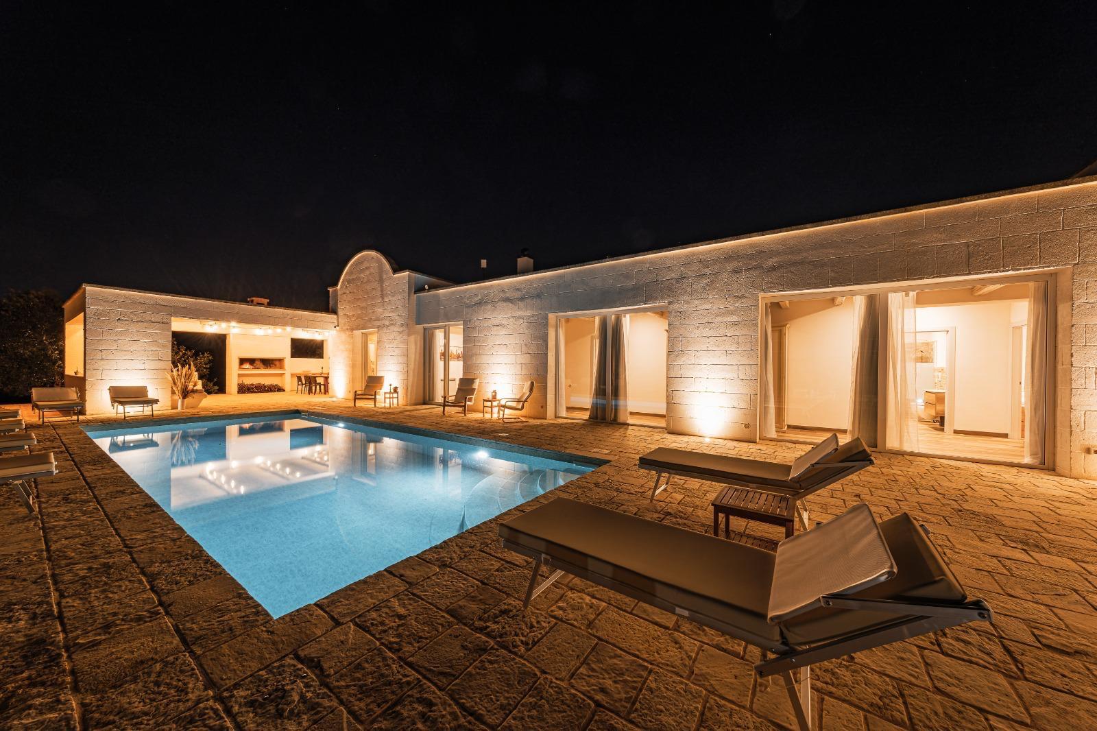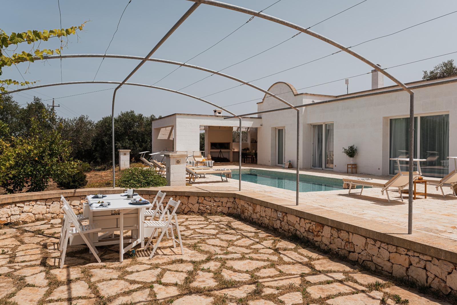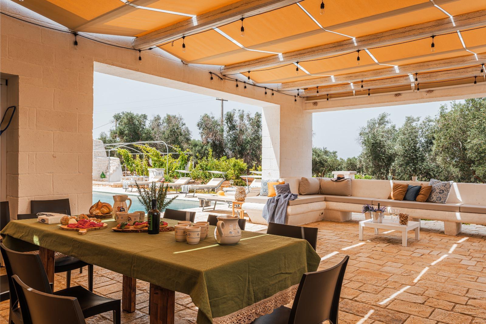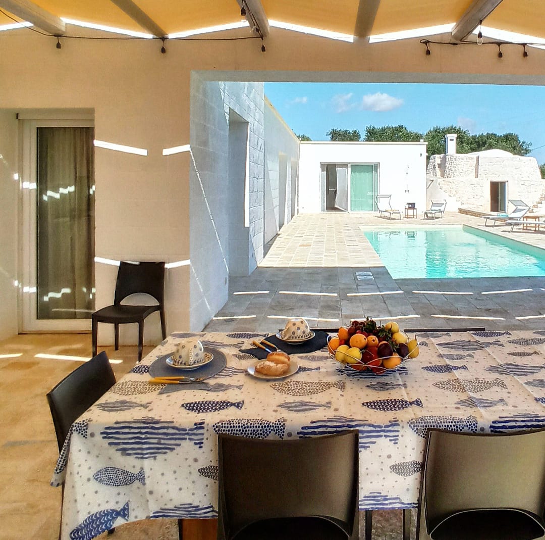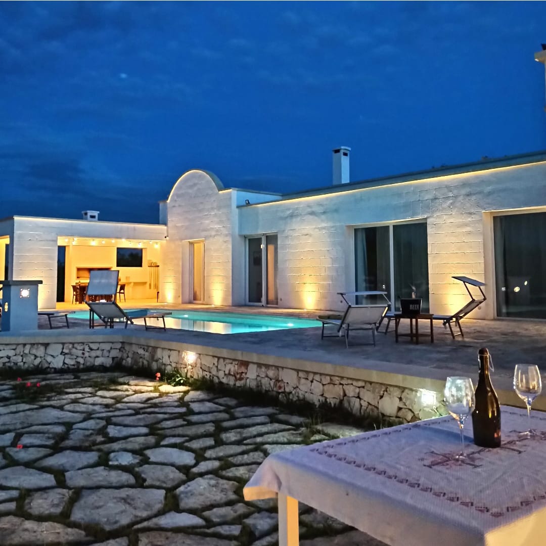 A far da cornice a tutto vi sono le verdi e rigogliose chiome degli ulivi della vallata che circondano una splendida piscina dalle forme classiche e dal colore turchino vivace, attorno alla quale ci si può comodamente distendere e rilassarsi rigenerandosi vivendo la Puglia nella sua autenticità, in assoluta pace e relax.