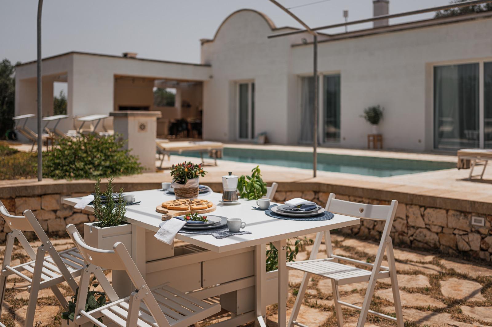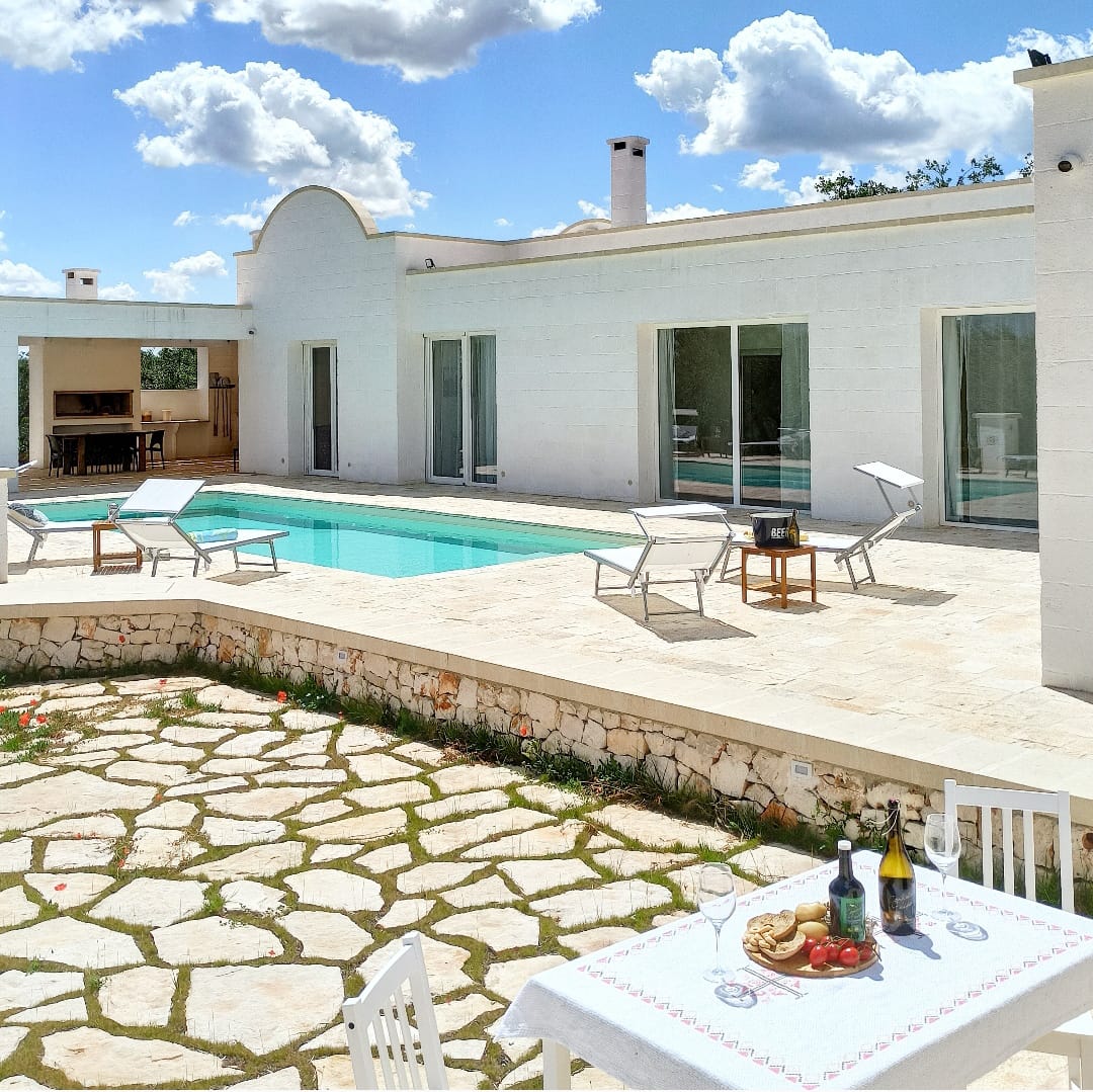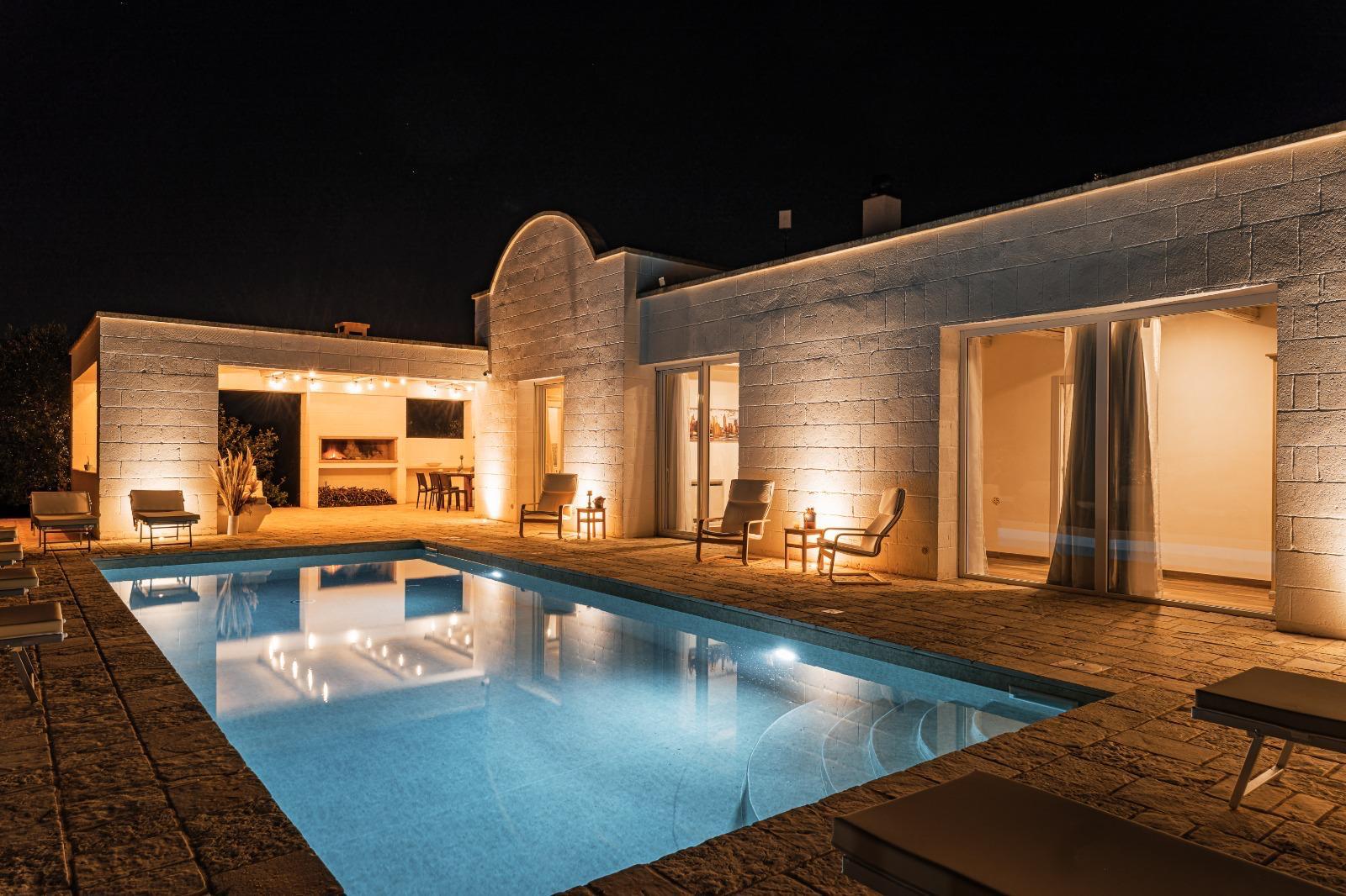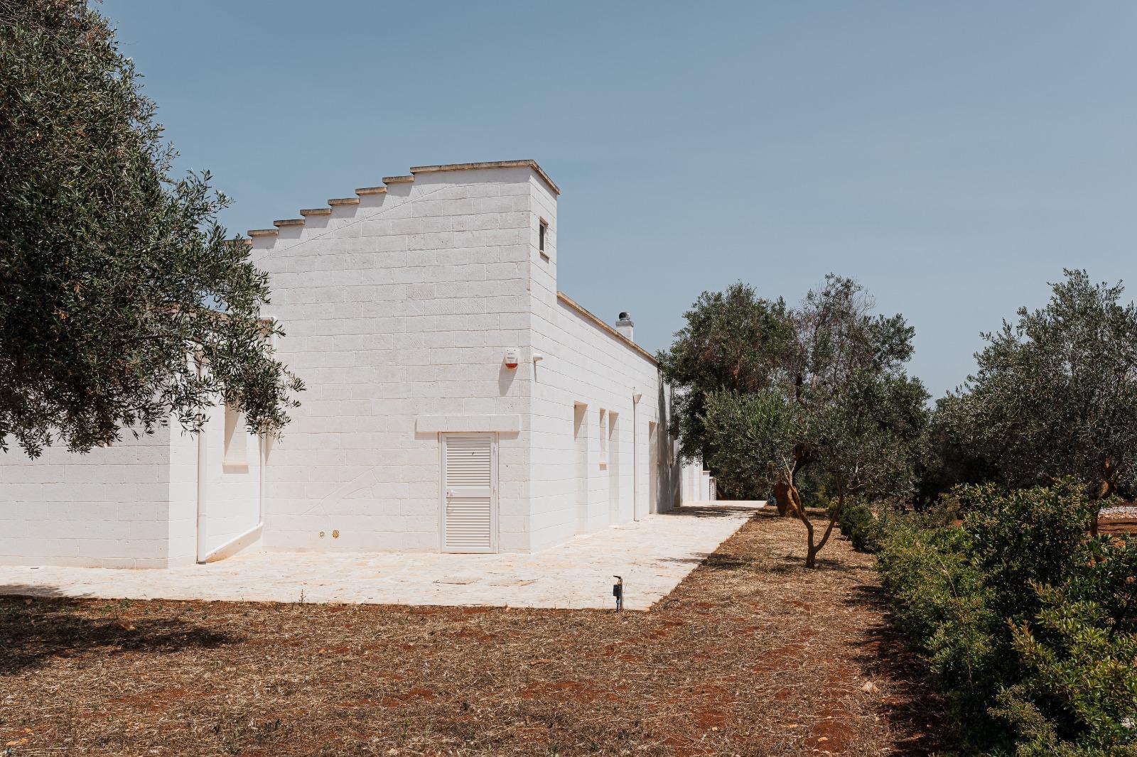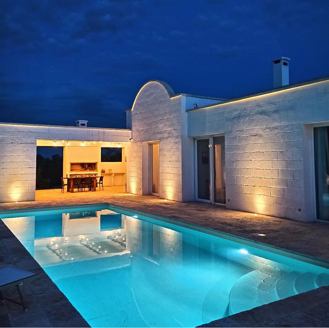 A far da cornice a tutto vi sono le verdi e rigogliose chiome degli ulivi della vallata che circondano una splendida piscina dalle forme classiche e dal colore turchino vivace, attorno alla quale ci si può comodamente distendere e rilassarsi rigenerandosi vivendo la Puglia nella sua autenticità, in assoluta pace e relax.