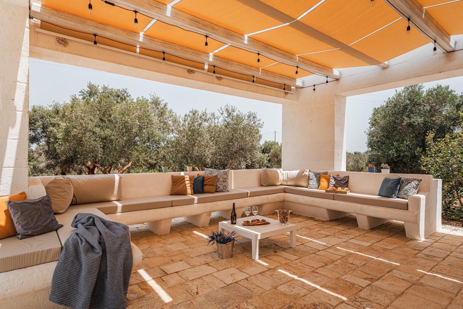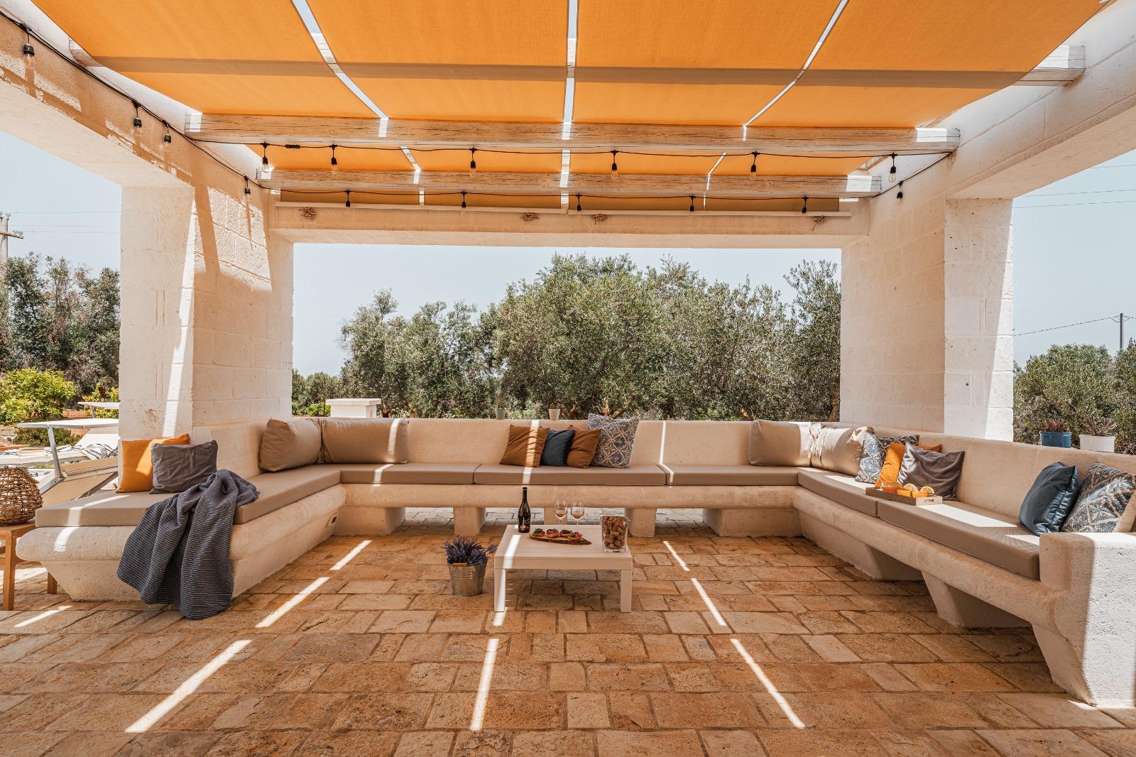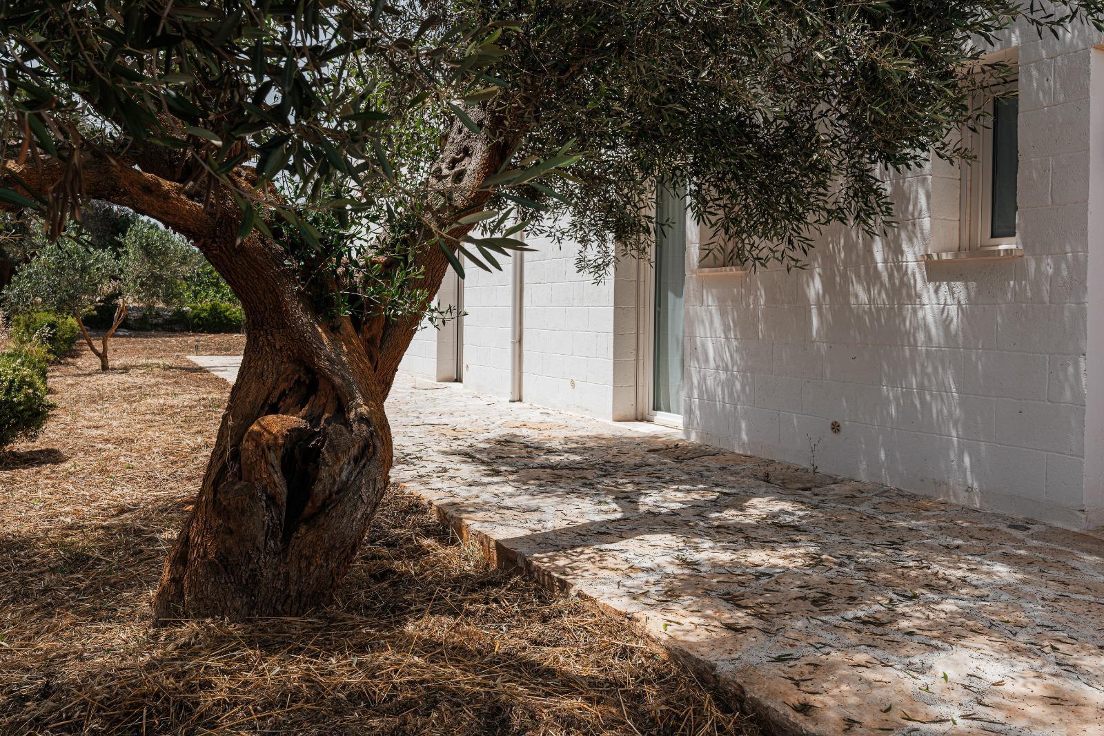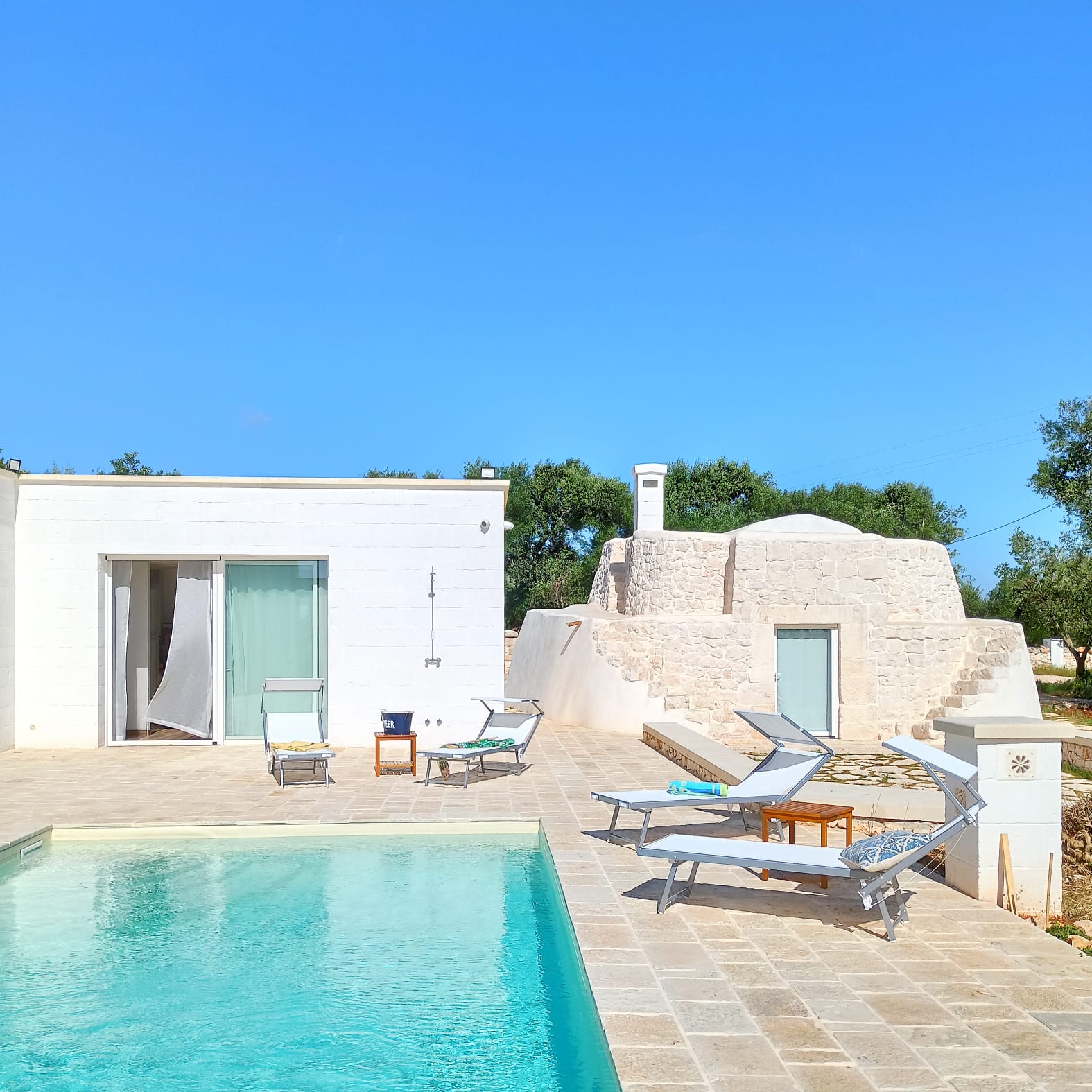 A far da cornice a tutto vi sono le verdi e rigogliose chiome degli ulivi della vallata che circondano una splendida piscina dalle forme classiche e dal colore turchino vivace, attorno alla quale ci si può comodamente distendere e rilassarsi rigenerandosi vivendo la Puglia nella sua autenticità, in assoluta pace e relax.