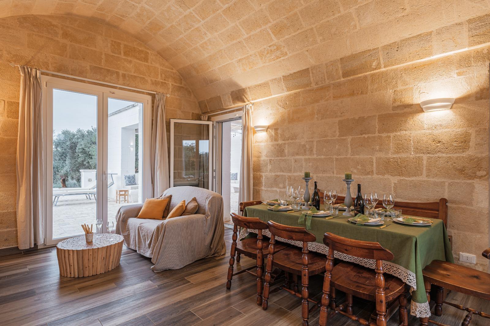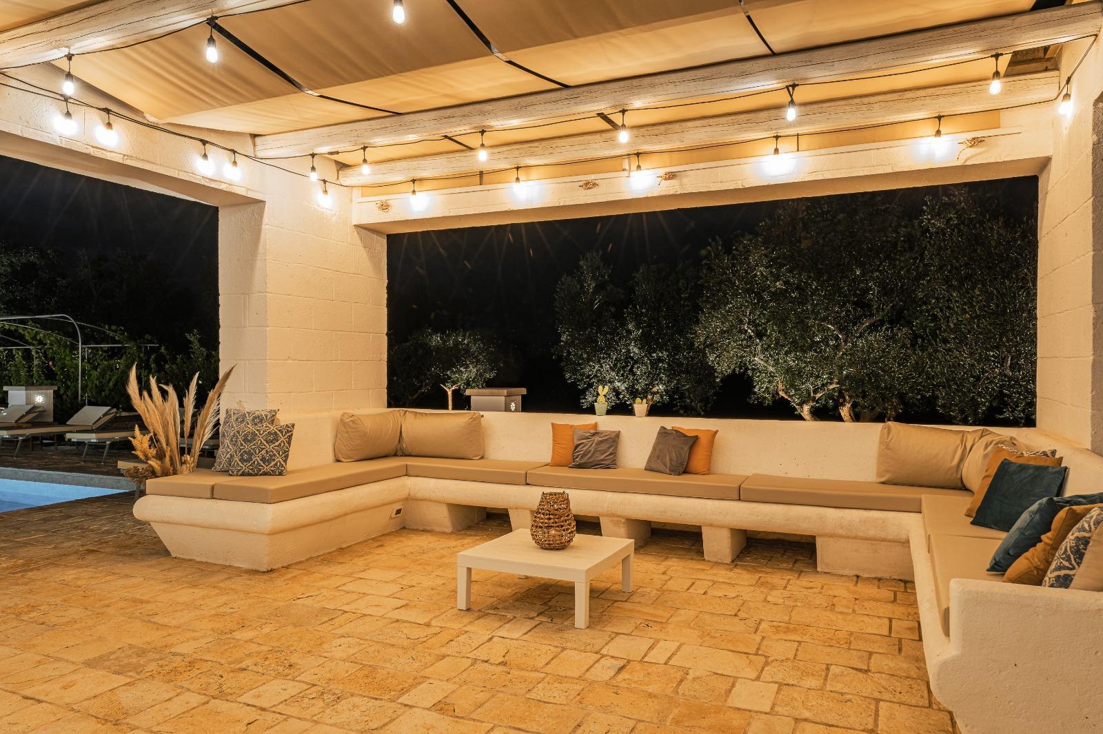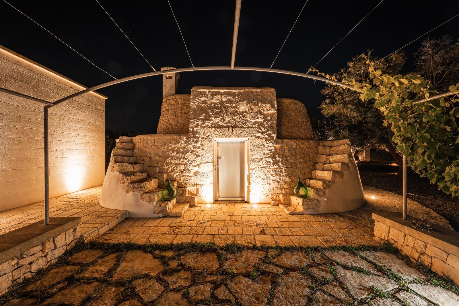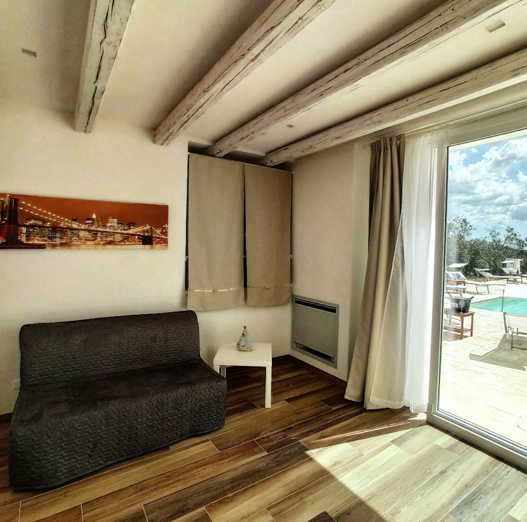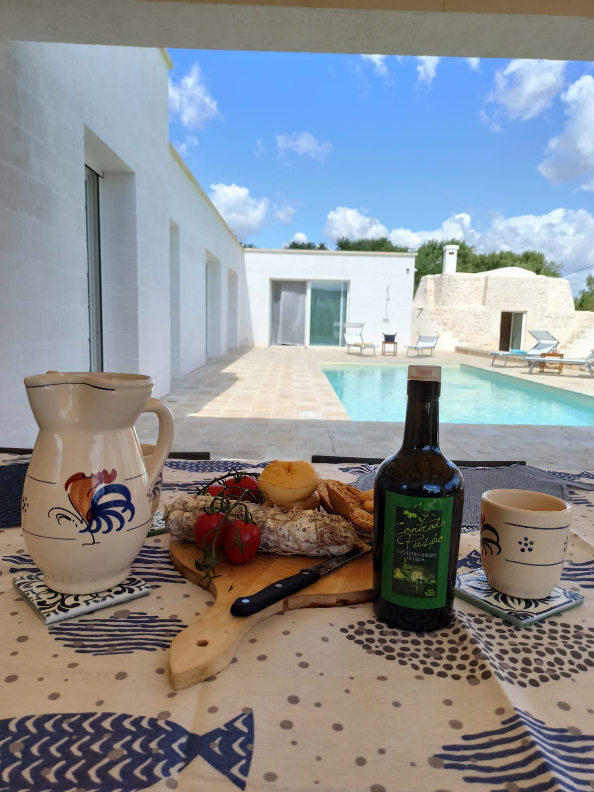 A far da cornice a tutto vi sono le verdi e rigogliose chiome degli ulivi della vallata che circondano una splendida piscina dalle forme classiche e dal colore turchino vivace, attorno alla quale ci si può comodamente distendere e rilassarsi rigenerandosi vivendo la Puglia nella sua autenticità, in assoluta pace e relax.