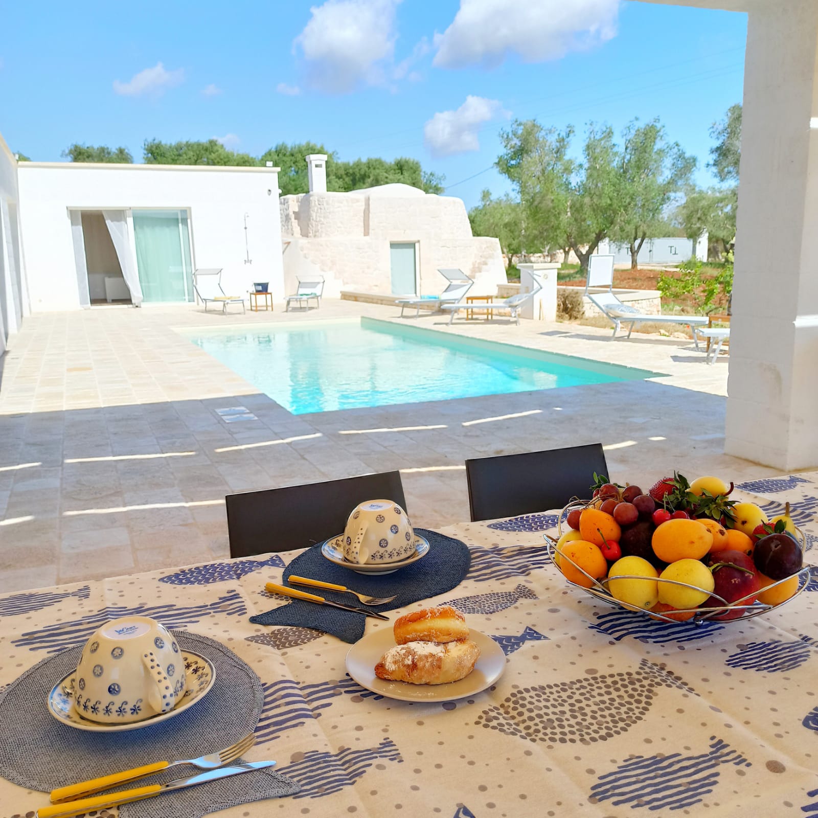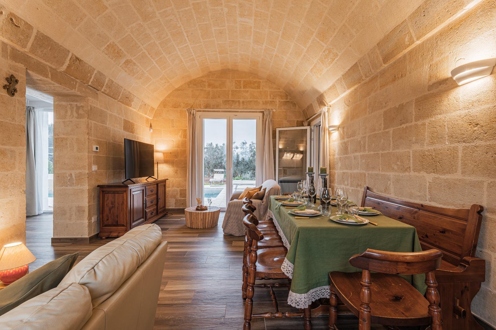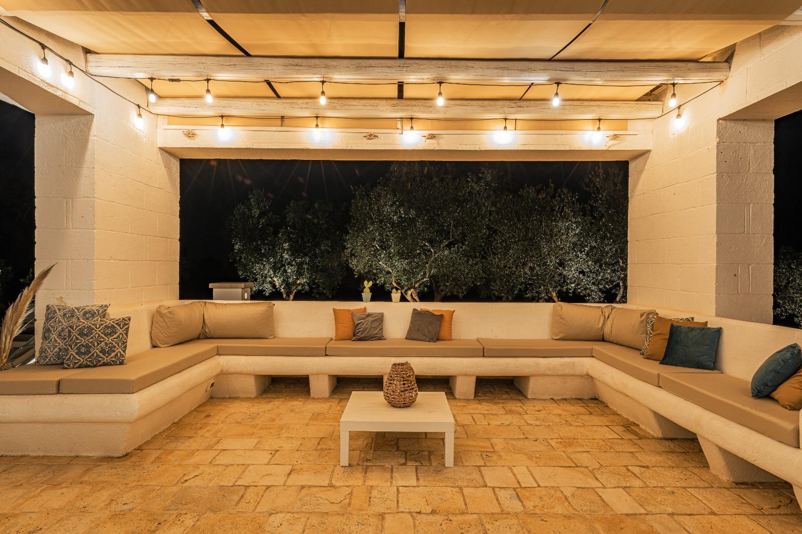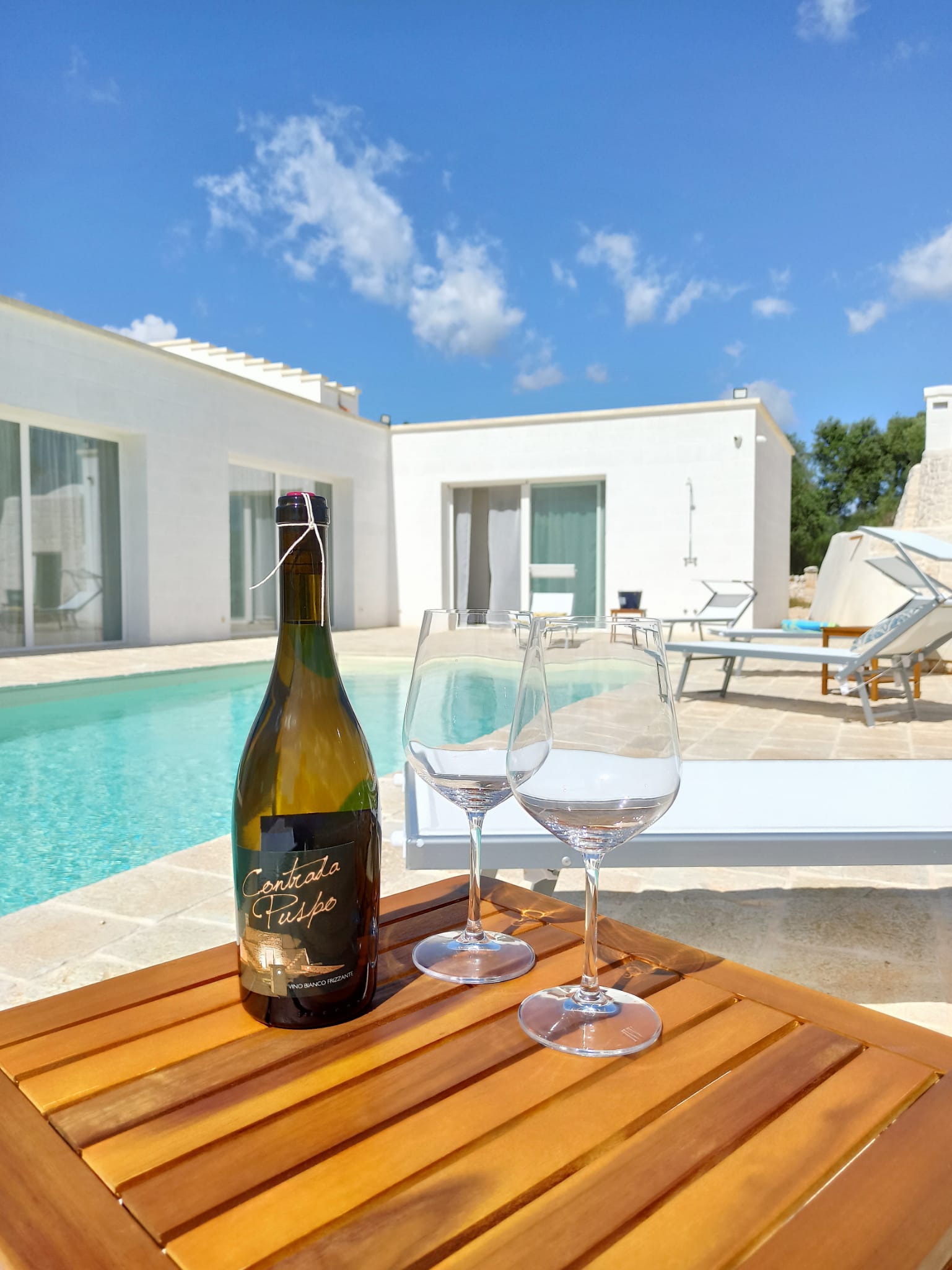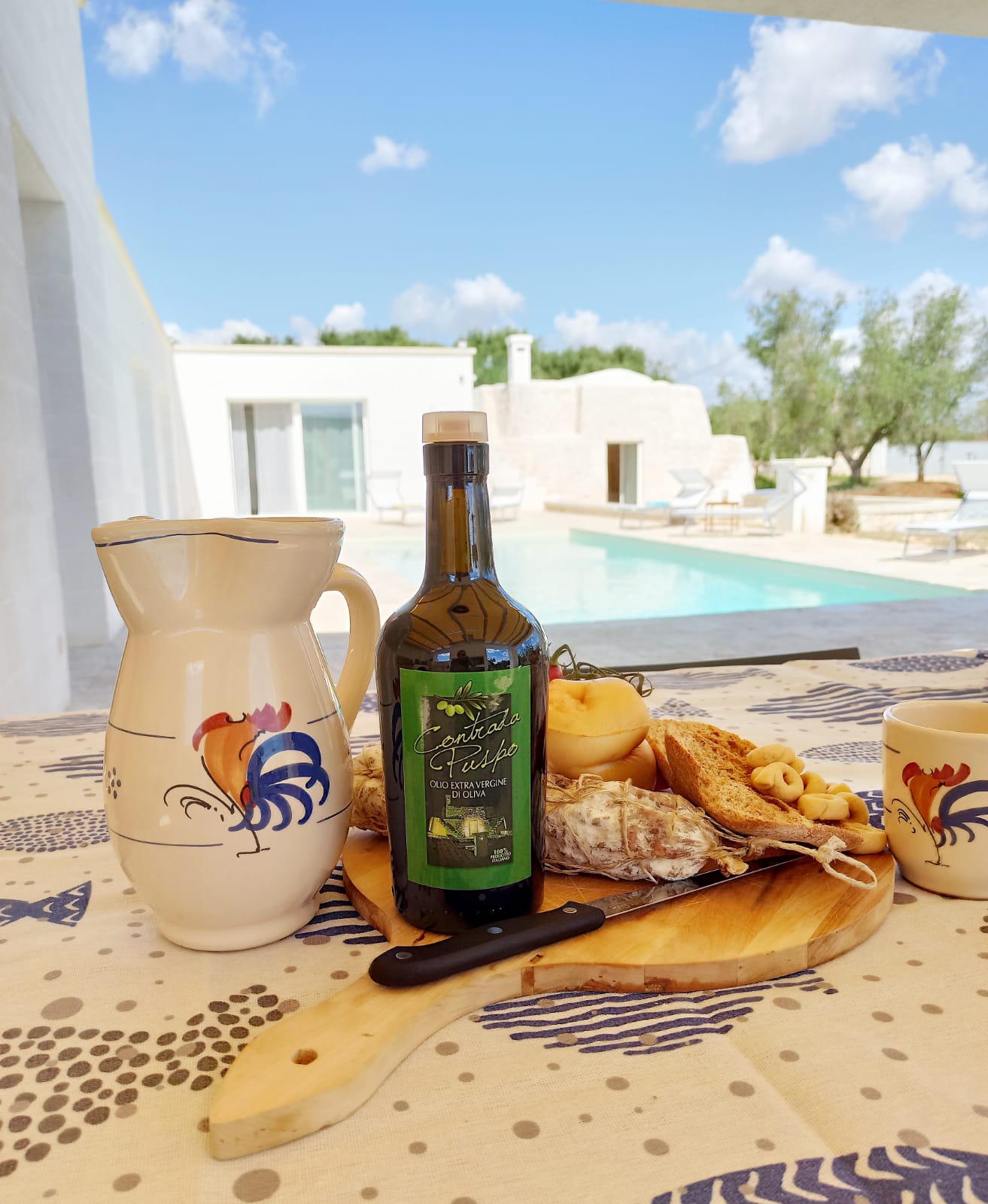 A far da cornice a tutto vi sono le verdi e rigogliose chiome degli ulivi della vallata che circondano una splendida piscina dalle forme classiche e dal colore turchino vivace, attorno alla quale ci si può comodamente distendere e rilassarsi rigenerandosi vivendo la Puglia nella sua autenticità, in assoluta pace e relax.